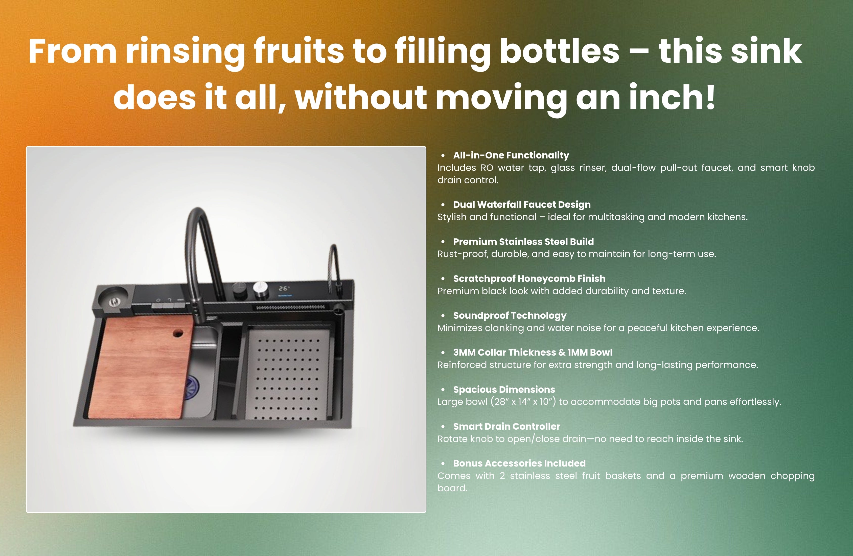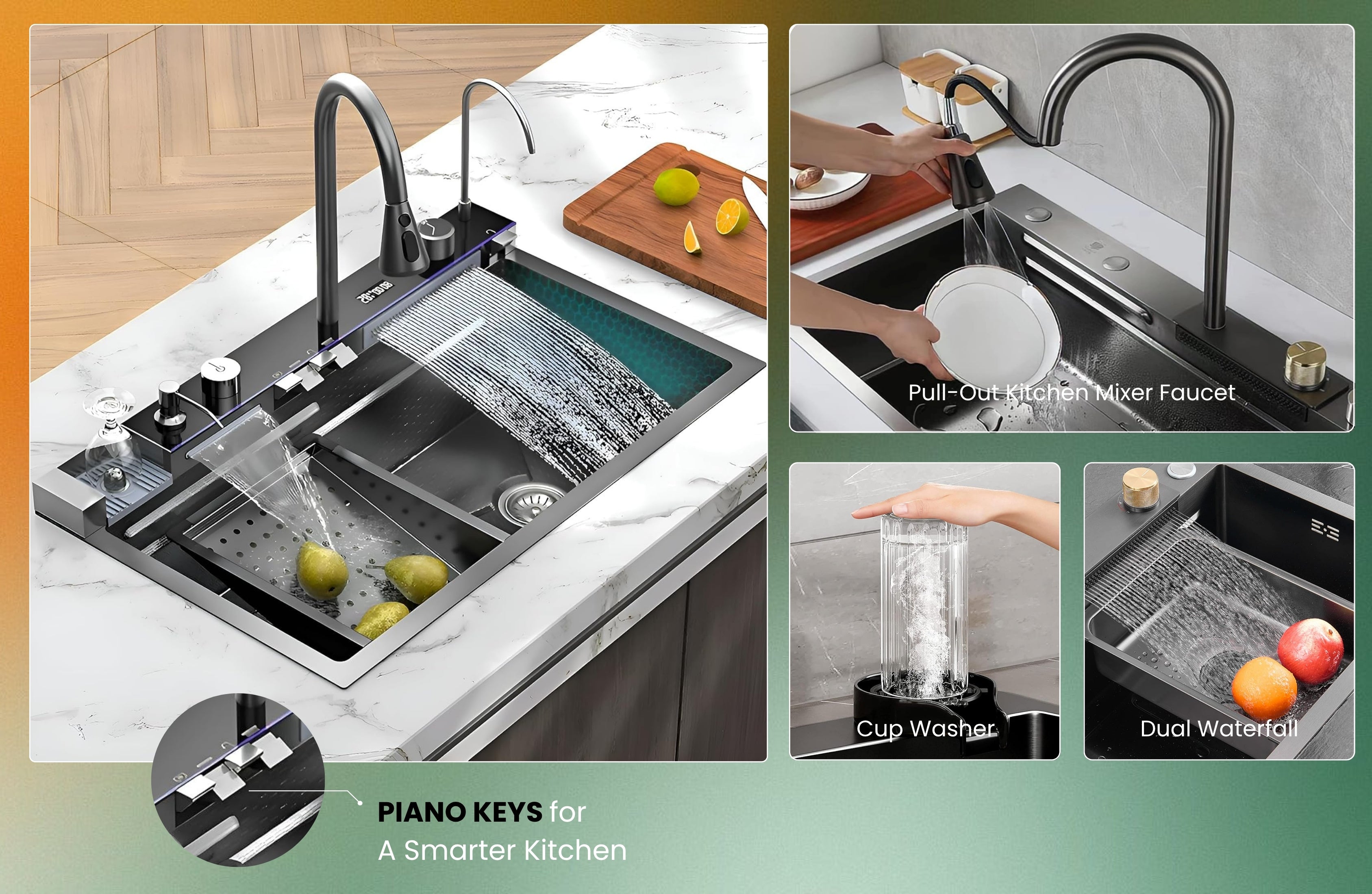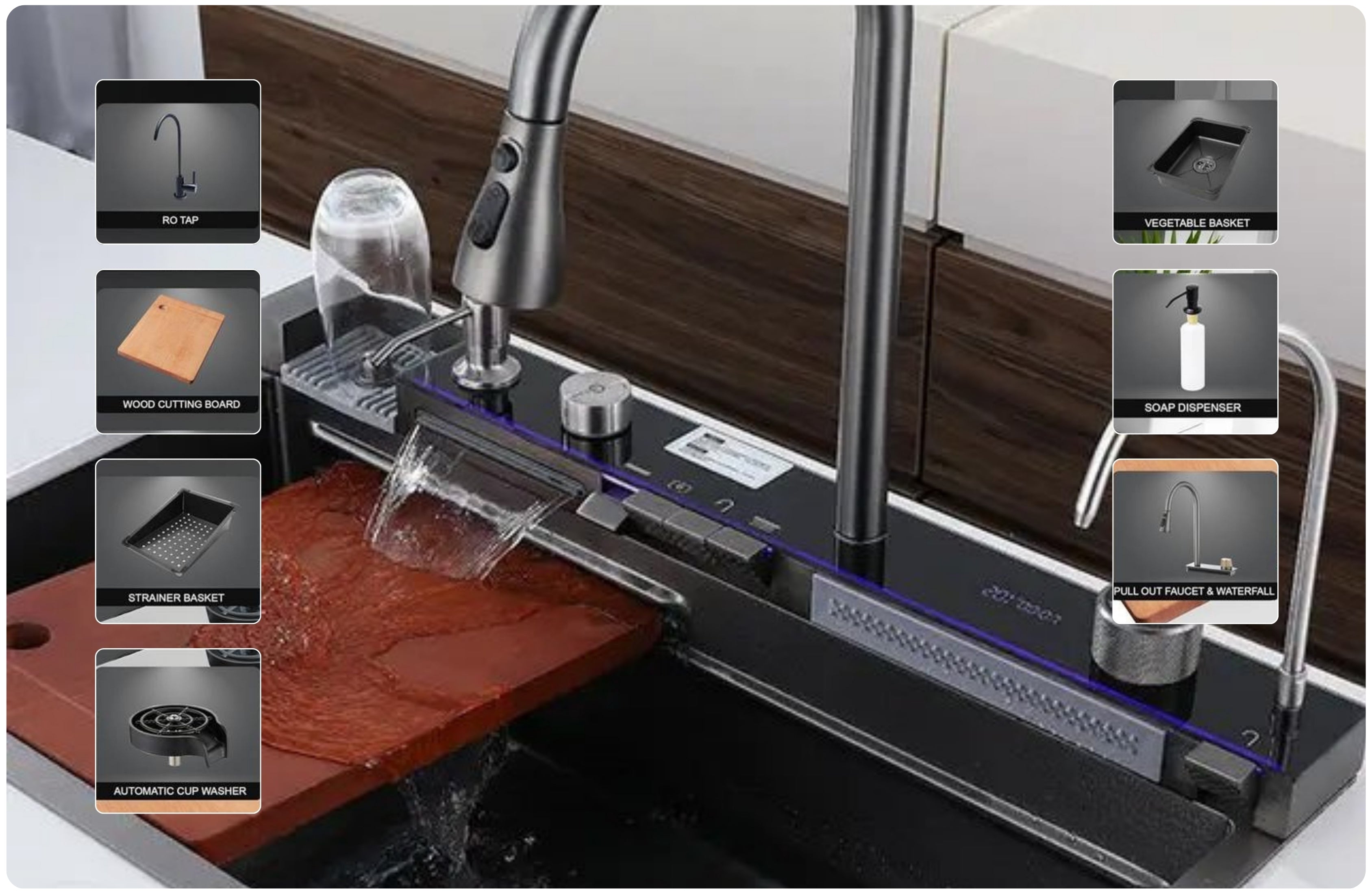 Featuring a dual waterfall faucet with adjustable keys, built-in RO water tap, glass rinser, LED display and temperature control, and a pull-out sprayer with dual water flow, this sink delivers a seamless, high-performance kitchen experience. The integrated smart knob drain controller offers precise water flow management, while the soundproof and anti-scratch construction ensures long-lasting durability with everyday use.