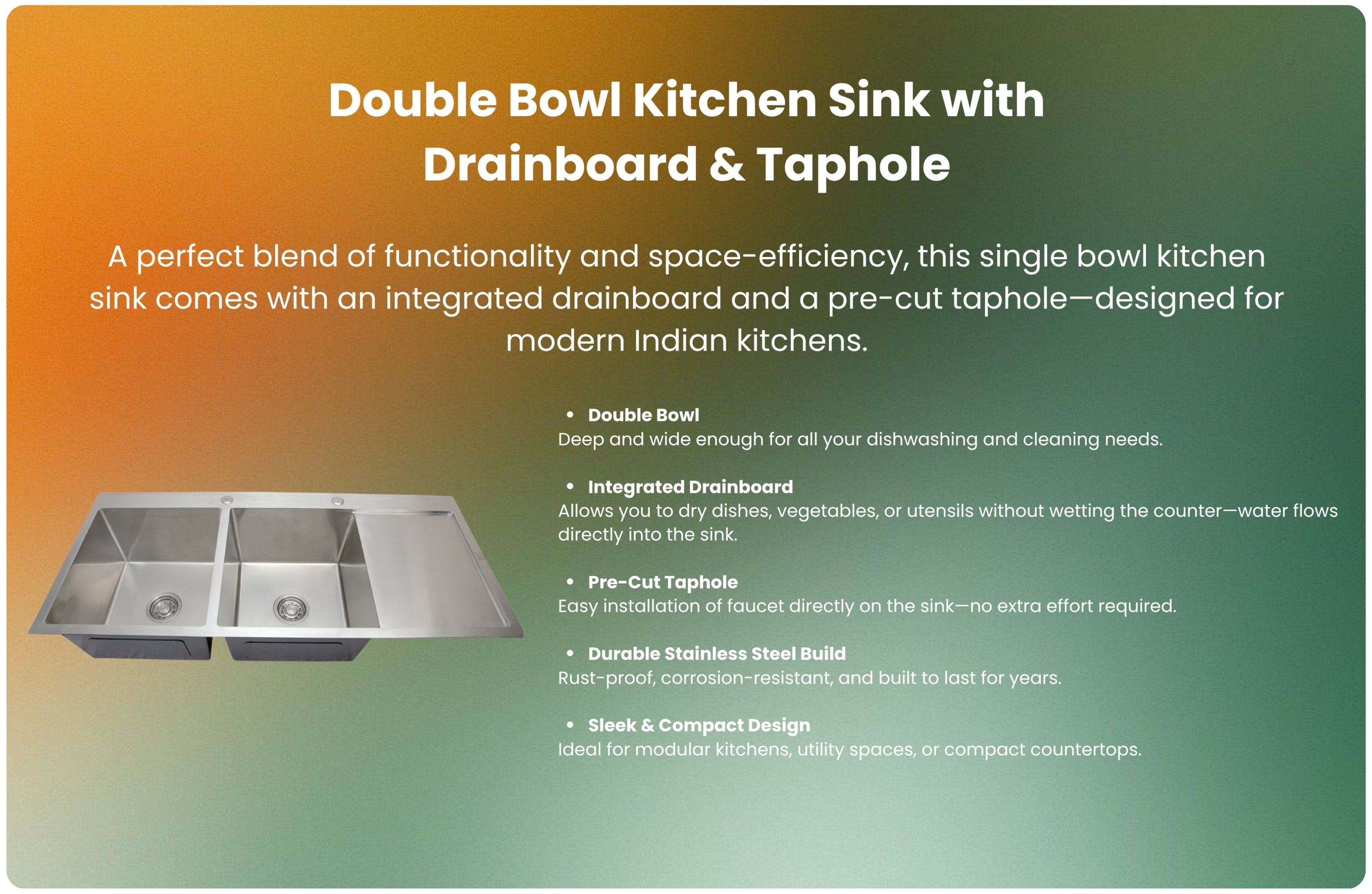 Double Bowl With Drainboard With Tap Hole