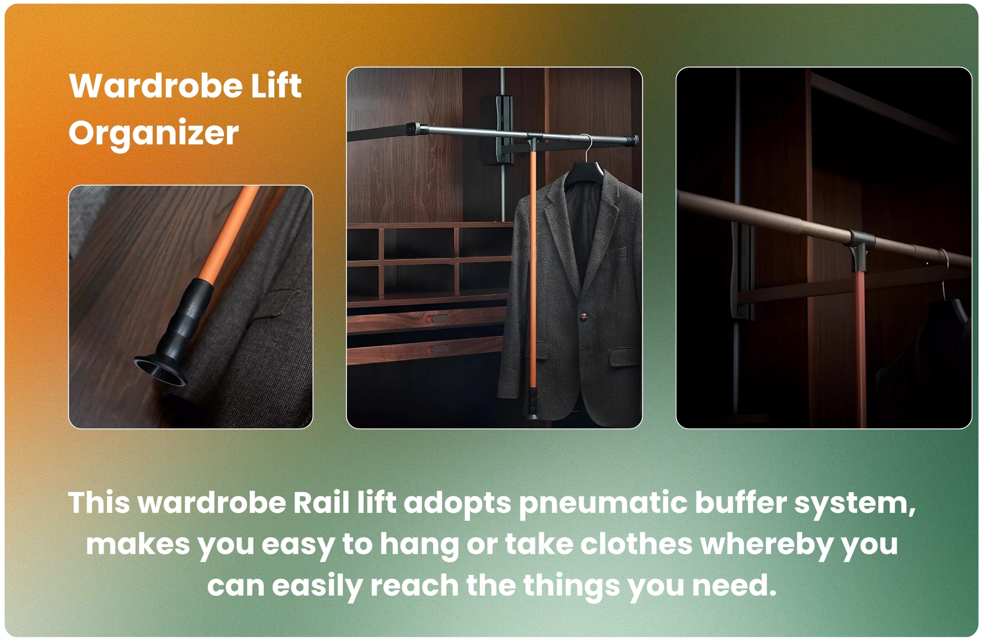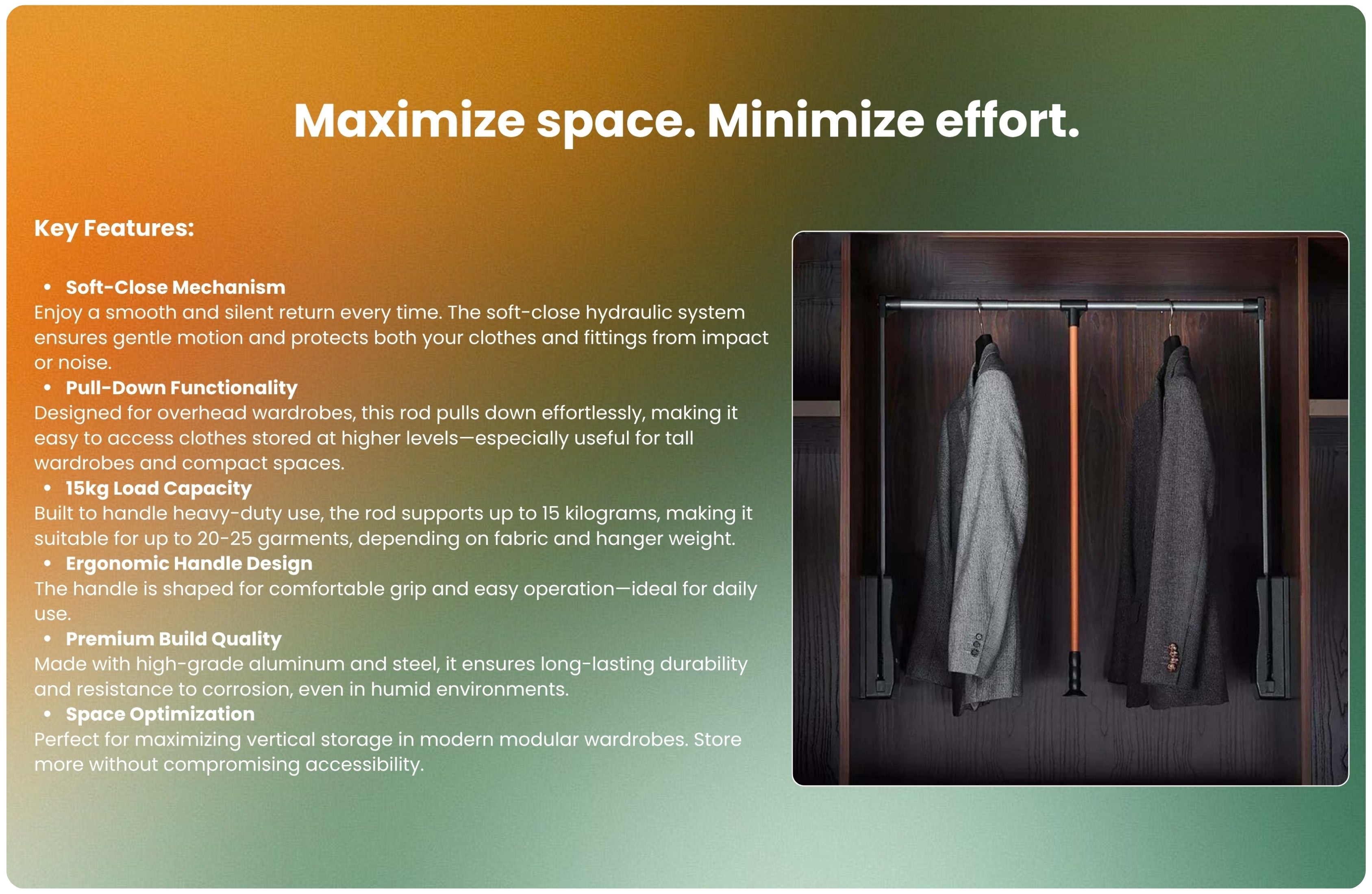 Equipped with a pneumatic buffer system, the collapsible arm glides down smoothly and returns softly. This pull-down design lets you access high-hanging clothes effortlessly—no step stools or reaching required. -
